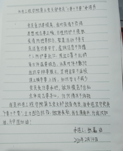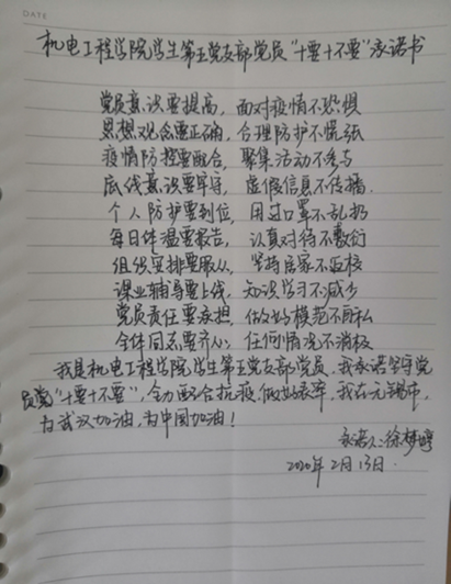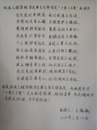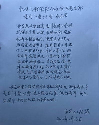 支部书记黄彦军、支委会成员王聪聪和党员代表张嘉怡共同拟定了英国上市公司365员工第五党支部党员“十要十不要”承诺书。王聪聪同志代表支部全体党员宣读英国上市公司365员工第五党支部防范疫情“十要十不要”承诺书。全体党员手写承诺书并签字。