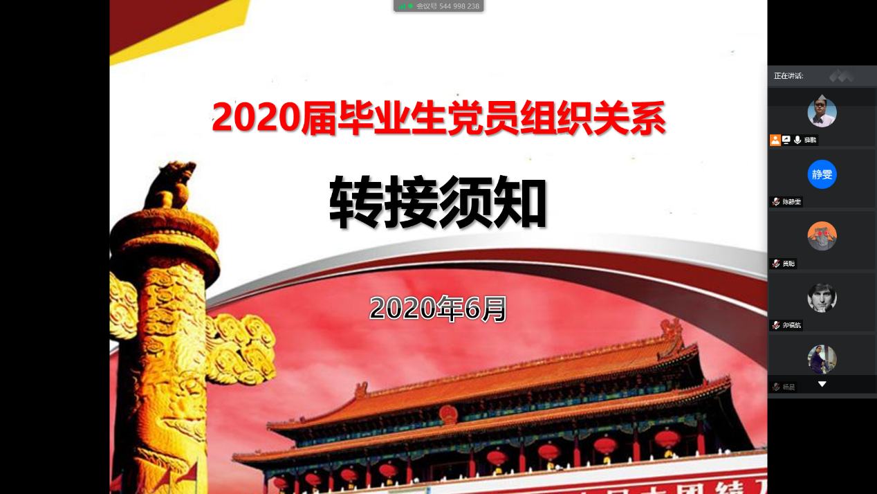 会上薛鹏同志从2020届毕业生党员组织关系转接基本介绍、党员组织关系转至何处、能转接党员组织关系的党组织、转接党员组织关系注意问题、党费及预备党员的注意事项五个角度对本年度毕业生组织关系转移工作进行了动员、讲解和实施部署,对组织关系转移中易发常发问题进行了说明并回答了毕业生党员关于组织关系转移相关的问题。
