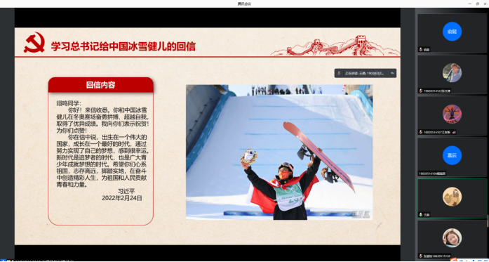 支部书记王晶首先带领大家学习了《习近平总书记给中国冰雪健儿的回信》, 王晶指出中国的冰雪健儿们在冬奥会赛场上画上了浓墨重彩的一笔,他们从小经历了诸多磨砺,才能在赛场上把最好的体育精神展示出来。习近平总书记给冰雪健儿的回信饱含着对于中国的体育文化以及新一代青少年的盛情与期待。习近平总书记的目光不单单是望向了运动健儿和青少年,更是望向了那些追梦者,通过对运动健儿身上的体育精神来影响更多人。