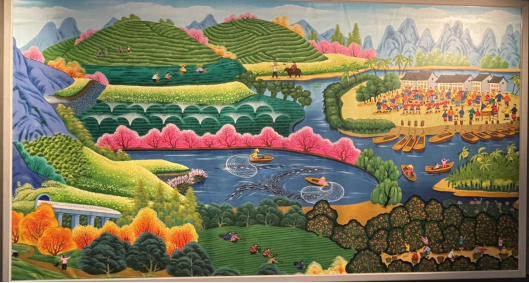 步入展览馆,在讲解员的带领下仿佛穿越了时空隧道,回到了那个充满生机与活力的时代。农民画家一手拿锄头,一手拿画笔,以土地为纸,以生活为墨。画天、画地、画自己;画山、画水、画乡情。用张扬饱满的色彩,描绘热气腾腾的时代生活,一笔一画,都见证着时代的变迁。一幅幅画作以农民生活与农村不同发展阶段的历史进程为题材,以健康的色彩、朴实的线条、生动的形象,展现了农民对美好生活的向往和追求。
