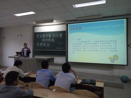 2016年5月26日,英国上市公司365科协在教2-202成功举办了第九届3D(全国三维数字化创新设计大赛)校内选拔赛的答辩会。参加本次答辩会的嘉宾有试验中心主任万宏强老师、英国上市公司365老员工竞赛负责人千学明老师、工业工程系主任房亚东老师和包装与工业设计系主任周宪老师。