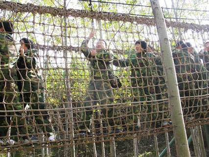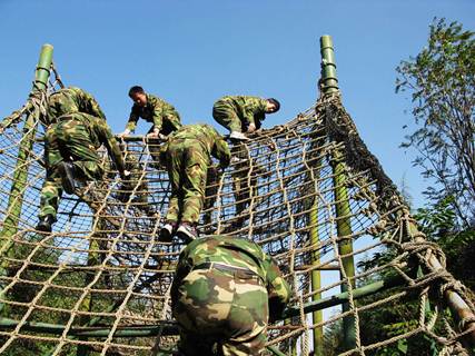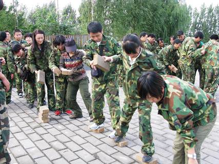 来到训练基地,教师们兴奋地穿上了迷彩服,迅速进入训练状态,教师们分两组依次接受了 “平步青云”、“翻山越岭”、 “垂直木墙”、“ 飞夺泸定桥”、“大摆船”、“冰海大逃亡”等项目的训练。在这里,老师们忘记了年龄,忘记了身份,忘记了彼此,忘记了生活的环境,全身心的投入到训练中。训练场上到处洋溢着团队协作的激情,到处可以听到队长指挥、分配任务的声音和队员之间相互提醒的声音,当所有队员在队长的策划和指挥下顺利完成各项任务时,大家都情不自禁地欢呼起来,为胜利,更为大家的团结协作。在这里大家忘记了年龄、忘记了职位、忘记了性别,磨练了意志、熔炼了团队,为教师队伍的团结协作奠定了坚实的基础。这次拓展内容新颖又极富娱乐性,让我们在训练中体验到团队协作的力量,感受到同事之间的友情,同时也懂得了如何改善人际关系,关心他人,更为融洽地参与团队协作。