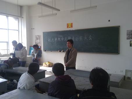 大会开始后,首先由09级辅导员薛鹏老师发表讲话。针对冬日天气寒冷、干燥、易发生火灾等不安全事件的客观情况,薛老师希望大家不要在宿舍内使用违规电器,从而引发火灾,给自己和他人的人身和财产安全带来损害。对于即将到来的圣诞、元旦双节,薛老师还叮嘱大家不要单独出行,如实在需要出行,应尽量结伴;班级如要安排活动,也一定要注意安全,做好安全防护措施;不要喝酒,不要打架,如若发现将严格处理。