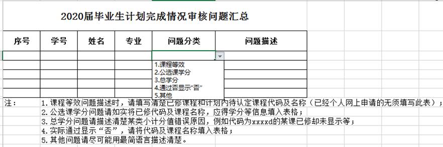 图为2020届毕业生计划完成情况审核问题汇总表