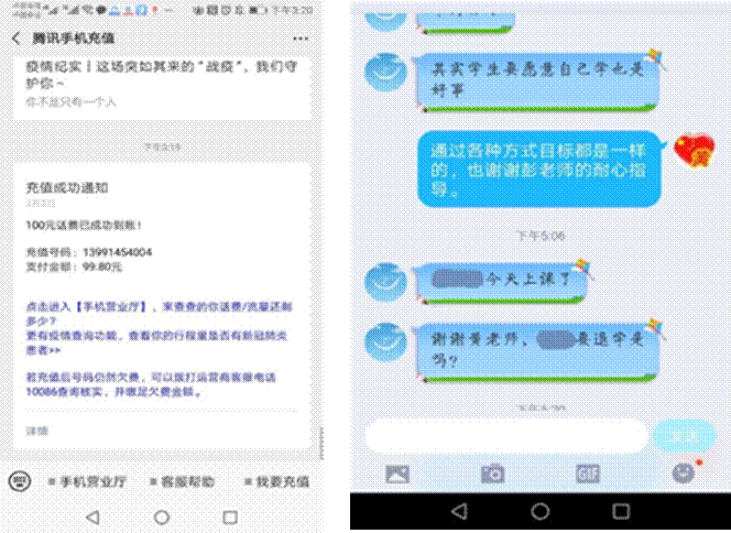 图为2018级辅导员黄彦军老师为保证员工顺利上课的话费充值记录及课后跟踪员工上课情况与任课老师的对话记录。