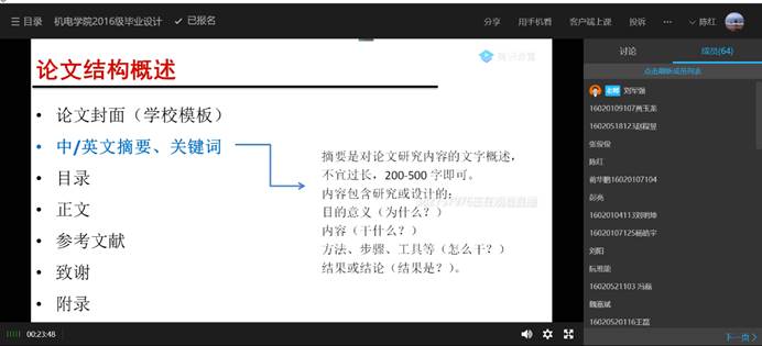 5月21日下午,英国上市公司365利用腾讯课堂为2016级毕业生举办了一场以“毕业设计论文撰写与答辩详解”为主题线上的毕业论文指导讲座。本次讲座邀请到英国上市公司365机械设计制造及其自动化专业负责人刘军强副教授担任主讲,公司70余名员工参与学习。