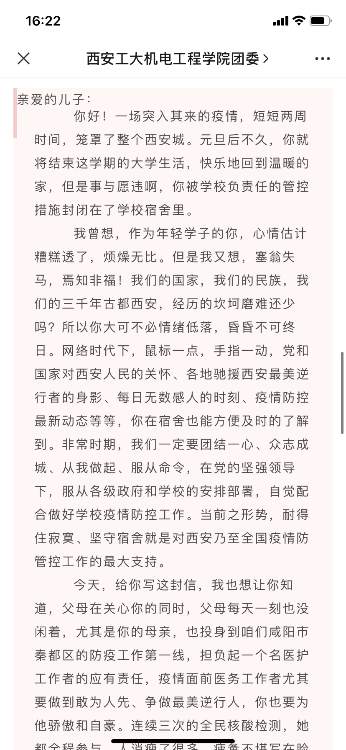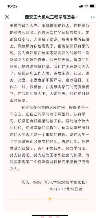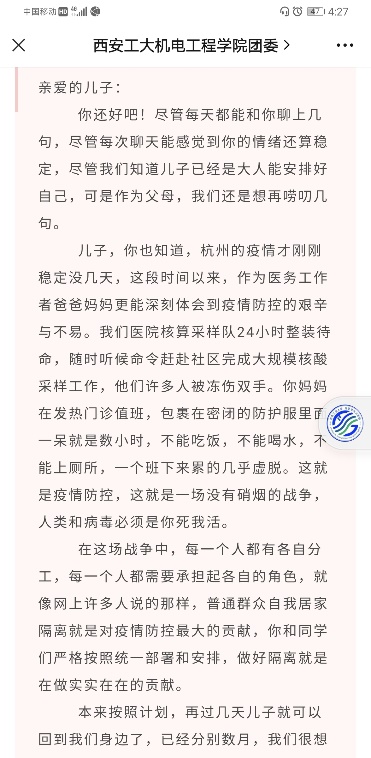 下午唐雅莉去员工宿舍配发完医用口罩,托着疲惫的步伐回到办公室,已是晚就餐时间,刚到手的饭菜来不及吃,匆匆忙忙就跑去餐厅执勤,确保员工有序就餐。路上接到员工家长打来的电话,询问封校管理期间孩子的学习生活情况,她耐心的给家长介绍了员工近况和公司疫情期间的安排,瞬间打消了家长的担心和忧虑。家长挂电话之前连连道谢,说有你们在我就放心了。那一刻,她深切感受到了自己肩上的责任。还有一些家长发来家书,信中写道:了解到你们公司对员工宿舍隔离期间吃饭、购物、洗浴等需求做了合理的安排,许多老师都住到公司公寓,他们丢下爱人、父母、幼子,就是为了保护好你们!作为家长来说我真的无比感动,我们唯一的孩子在被他们庇佑,感恩这一份份静默又无私的付出。儿子你们一定要尊重、理解并支持公司的安排。还没读完家长的信,她的眼角早已湿润,在这场没有硝烟的战争面前,唯有同胞之间的理解和同理心才能让大家团结起来,战胜一切困难。