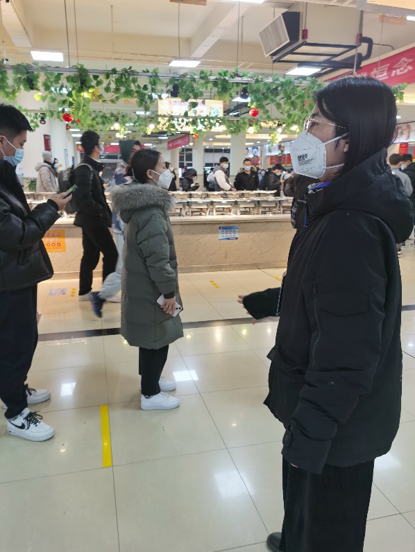 29日早晨七点,接到组长电话,紧急通知全员核酸,唐雅莉立即爬起床,匆忙洗漱后,15分钟内赶到核酸检测执勤点位,左手拿起对讲机接收指令,右手拿起小喇叭一遍遍的提醒:“请大家戴好口罩,保持一米五间距”、“后面同学快两步跟上”、“前面分成四路纵队”……平时很皮的同学最近也变得异常乖巧,服从公司安排,按时排队做核酸、错峰就餐、凭票洗浴、居寝线上学习,师生之间多了一些默契、理解和共同的期许。冬日的早晨冷风刺骨,两个小时的室外执勤脚已经冻到麻木,同事来电话说已在办公室煮好热乎的鸡蛋,你快上来吃早餐,我去换你。她心里一暖,战友情瞬间融化了冬日的寒冷。