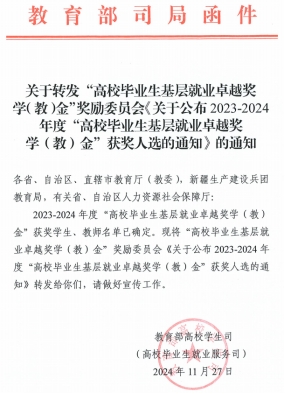 近日,中国教育发展基金会2023-2024年度“高校毕业生基层就业卓越奖学(教)金”获奖人选名单公布,经公司推荐、省级遴选推荐、奖励委员会评审,公司2017届机械设计制造及其自动化专业毕业生万欣欣获得该项奖励,这也是公司毕业生首次获得该项荣誉。