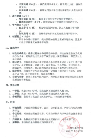 3月下旬,公司发布专项奖励办法,明确评选范围和标准,在满足评选范围的基础上,参评员工的毕业设计(论文)需按公司要求完成归档,随后进一步从文献应用、问题分析、设计能力、工具使用、工程与社会、沟通能力、项目管理、学习能力和创新能力九个维度进行综合评价,结合毕业设计评定分数得出最终排名。