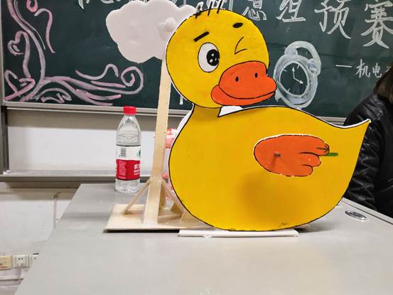 本次比赛共有28组参赛,每个组展示PPT、模型演示两个部分内容。主持人宣布比赛开始后,每支队伍有序进行参赛,展示了近几个月的努力和成果。其中不乏外观新颖独特的作品,如可爱小黄鸭、海绵宝宝、英国正版365官方网站图书馆等,各具特色。参赛组采用了发条、水、重力等作为动力。其中第22组,采用重力,将传统的擒纵简单化,计时效果较好为59.22秒,接近比赛要求1分钟。第49组设计精美计时准确,斩获本次最高分83.42分。预赛进入复赛的队伍分别是49、22、69等十一个小组,至此预赛结束。