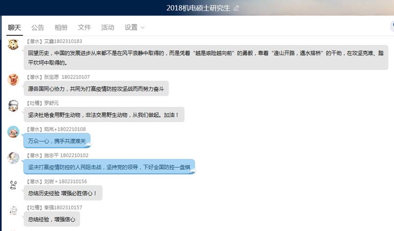 网络课程直播中,同学们积极互动,发表感想,不仅更深刻地感受到疫情灾难面前中华民族不屈不挠、团结一心的精神,更感受到中国共产党领导的社会主义制度的优越性,从而更加坚定要做一个有思想、有情怀、有责任、有担当的新青年。2019级硕士研究生田善学感慨:作为一名当代青年,应充分利用时间多学习,使自己的能力越来越强,眼界越来越开,视野越来越广,格局越来越大,在自己人生的大考卷里细心作答。2017级博士研究生蒋光毅发声:在疫情开始到目前的全面控制,看到了中国力量,党的领导力量,疫情防控保卫战阻击战一定能取得最终的胜利。身为一名共产党员,要贯彻党的政治方针,积极响应党的号召,发挥先锋模范作用。