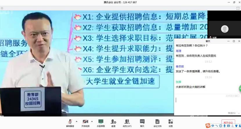 本次会议由高珊老师主持,在课程开始前,她指出2020届春招在疫情下缓缓拉开帷幕,为了帮助员工们抓住“金三银四”的求职高峰,尽快适应线上视频面试的节奏,全国高等公司员工信息咨询与就业指导中心于4月12日下午19:00举办《“云”上求职 逆势飞跃》直播公益课程,此次课程邀请了北京万学教育科技集团董事长,华富嘉辰投资基金创始合伙人——张锐主讲。高老师希望每位员工都能够认真听取专家的意见和建议,积极应对新的就业形势和求职模式。
