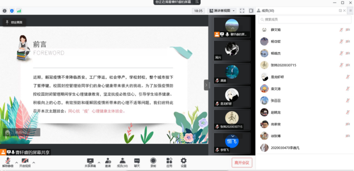 曹轩睿首先就疫情封校期间同学们的心理焦虑问题为大家进行了心理健康知识的宣传,缓解大家的焦虑情绪,同时邀请同学们分享疫情封校期间自身的心理状态、学习状态、生活作息、情绪变化等方面存在的问题以及自我应对方法,用“我来说”而不是“听你说”的方式,为同学们带来心灵处方。