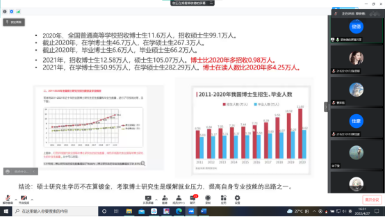 第二阶段,侯思雨向各位同学介绍了博士研究生的申请时间、申请流程、入学时间、以及具体的招生方式;其次,通过对比2020、2021年全国博士研究生在校生、毕业生人数,分析了读博的必要性;最后鼓励在座的同学们一定要树立宏大理想,克难攻坚,提升自己的能力和学历,为着自身更大的发展创造出更好的平台。会议第三阶段,公司2021届博士研究生王鑫刚与大家交流了自己直博的心路历程,做了《志当存高远---“本科生”到“博士生”的“华丽”转场》主题报告,他先介绍了直博的前提条件,直博的学习期限,并结合自己学习过程中面临的一些主要问题,切合实际且深入地介绍了读博的学习经验。会议最后,2019级在读博士研究生、2021年国家奖学金获得者李卫鹏结合自己的读博历程,向同学们做了主题《坚定理想信念,不断努力进步,再创科研阵地新辉煌》的汇报交流,分享了博士选题、撰写和投稿科研论文的经验。