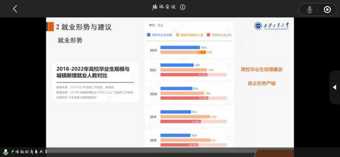 在就业形势与建议方面,尹老师深刻分析了当前就业形势,介绍了毕业选择工作和企业方面的建议,分析了工作需要选“适合”自己的,并强调性格和兴趣是选择未来职业的重要因素。