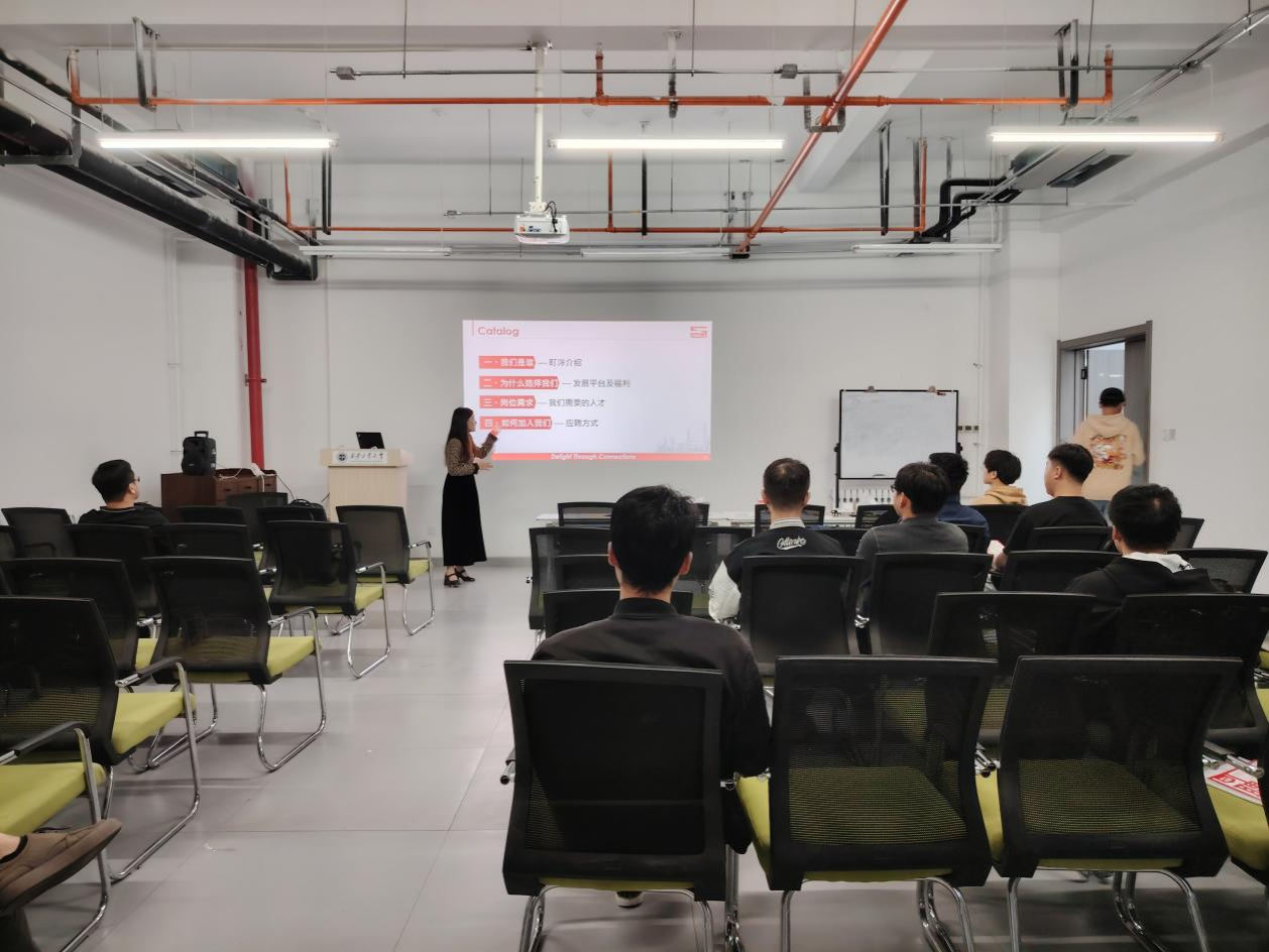 会上町洋机电(中国)有限公司人事主管朱晓贞女士首先介绍了公司基本情况、公司主营产品、地理位置、工作环境、住宿环境以及入职后培养机制,介绍了招聘岗位的晋升机制、员工福利和薪酬待遇以及朝九晚五的工作制度。最后,朱晓贞介绍了岗位招聘流程,并对工作职责进行了详细的分析和讲解。