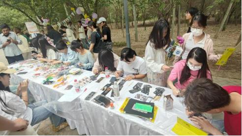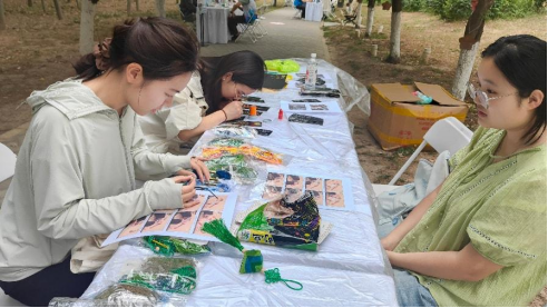 “五色丝缠,香囊问夏”香囊制作活动区,同学们通过挑选艾草、薄荷等中药材填充香囊,以五彩丝线进行立体编织。从卡纸到五彩线,从折叠到编织,每一步都充满了匠心与创意。短暂的远离喧嚣与繁忙,感受那份属于自己的独特情愫,在经纬交错间感受中华传统祈福文化的精髓。